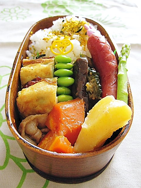 ・卵焼き、枝豆、アスパラガス、ウィンナ