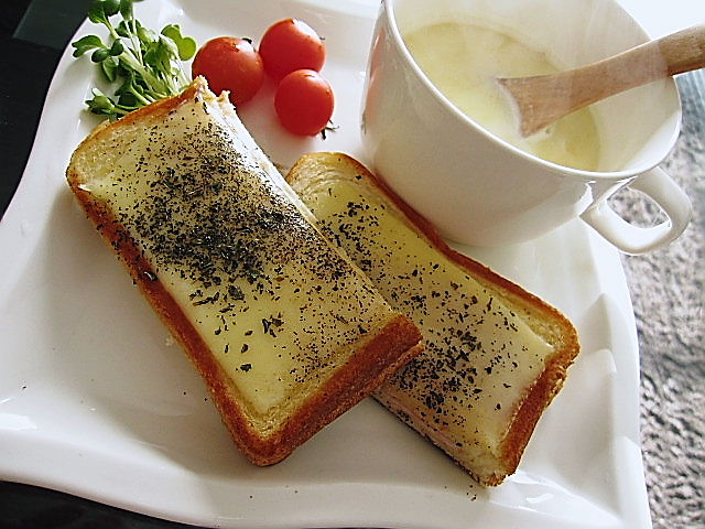 クロックムッシュとは、ハムとチーズを挟んだトーストを両面バターでこんがり焼いたもの。