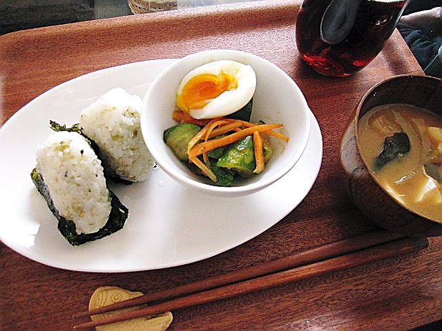 朝ご飯は軽めが良いというダーリンの要望に応えて、今日の朝食は小さめのおにぎり2つに浅漬け(+ゆで卵)、お豆腐の味噌汁です。