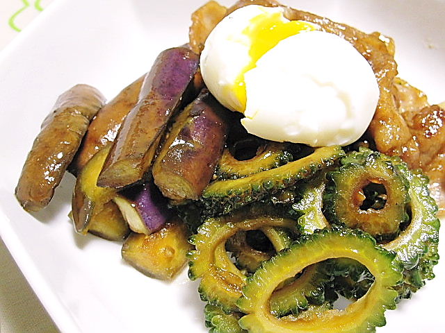 ・温玉のせ夏野菜と豚肉のオイスター炒め