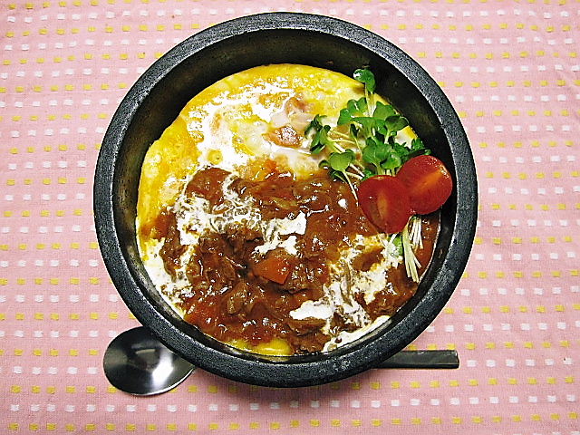 石焼き鍋を使った料理を作るゾ part 3の石焼オムハヤシです。(part 1、part 2)