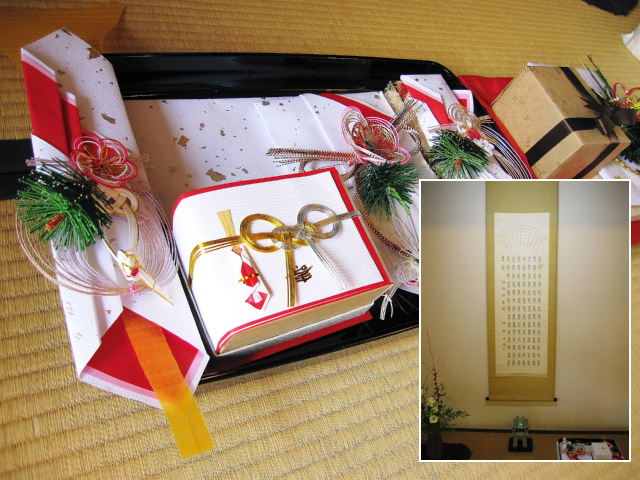 「筑紫亭」の方に、事前に「結納を含めたお食事会をします」と伝えておいたら、縁起の良い掛け軸(写真のもの)などを用意してくれました。